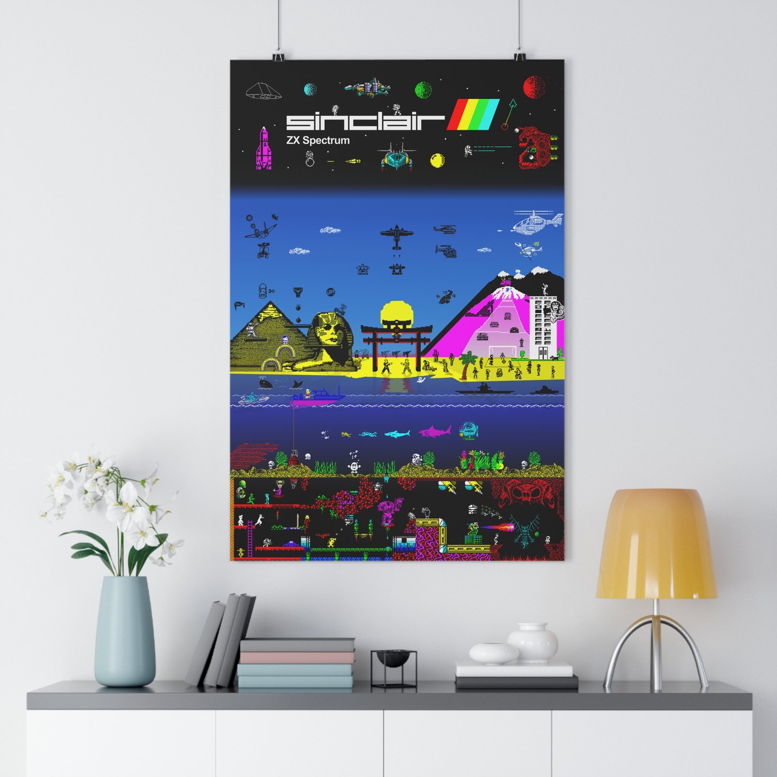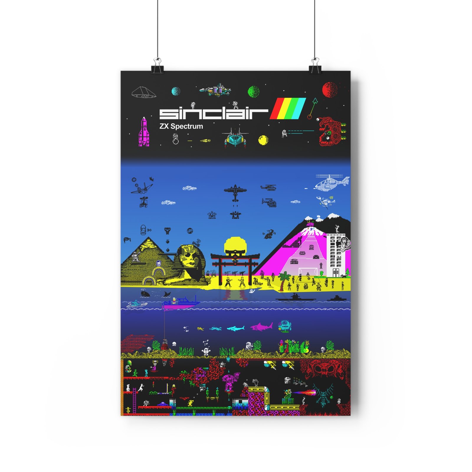 This epic speccy poster features dozens of your favourite games and characters frollicking together in a huge landscape from the bowels of hell all the way to space.